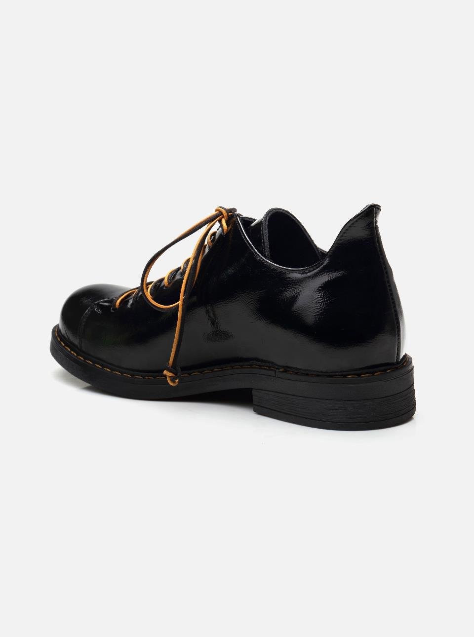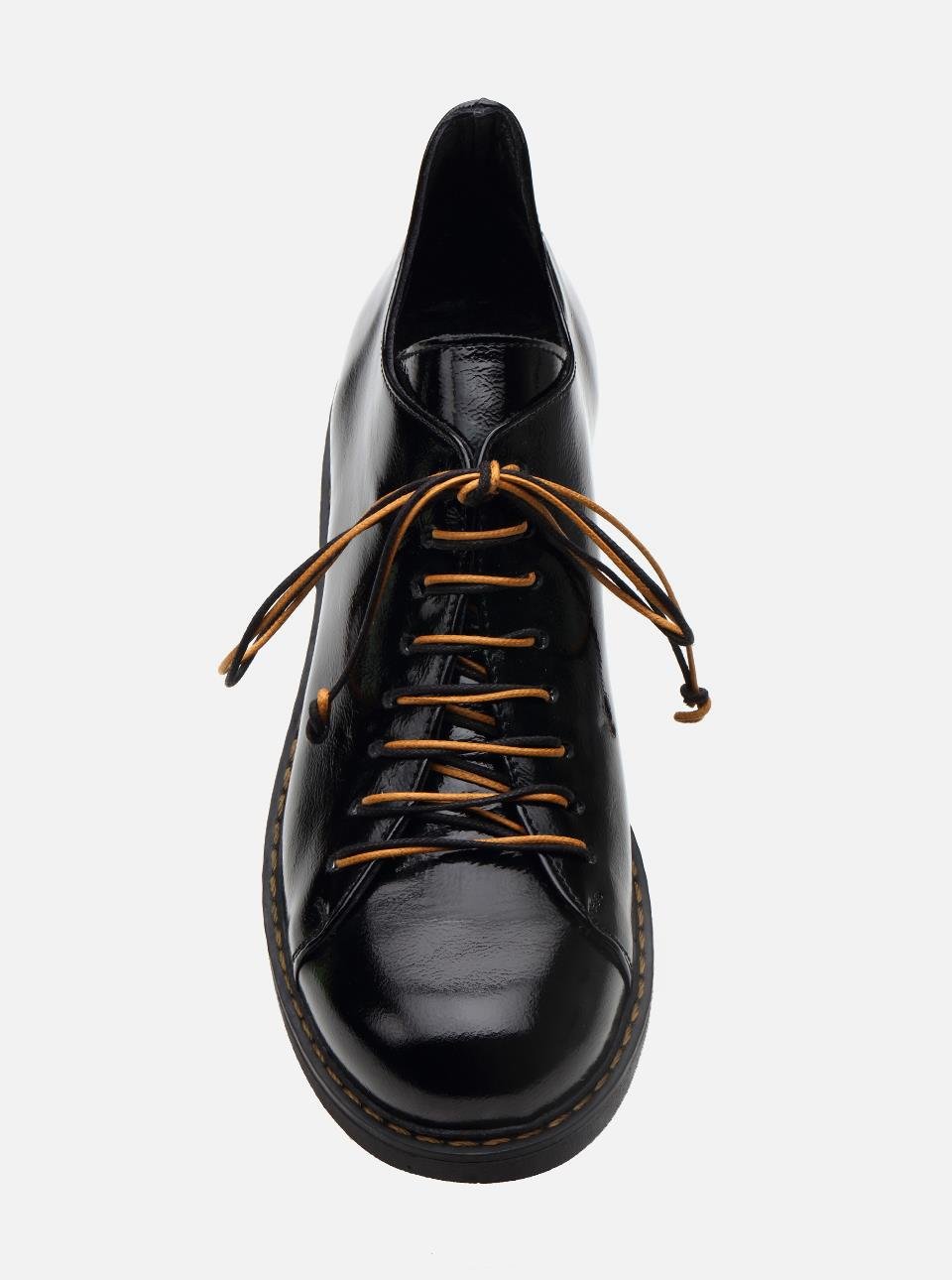 Siyah Bağcıklı Ayakkabı Gerçek Rugan Deri. Ayakkabıda yuvarlak burunlu kalıplardan vazgeçemeyen kadınlar için idal kışlık rahat ayakkabı.