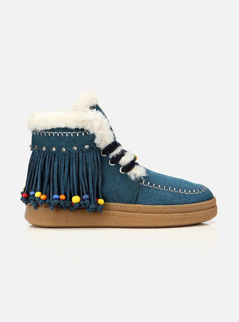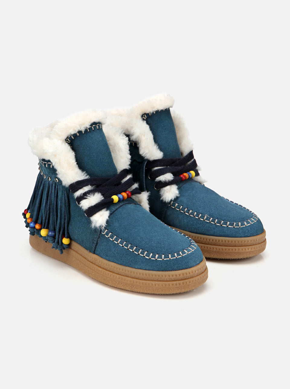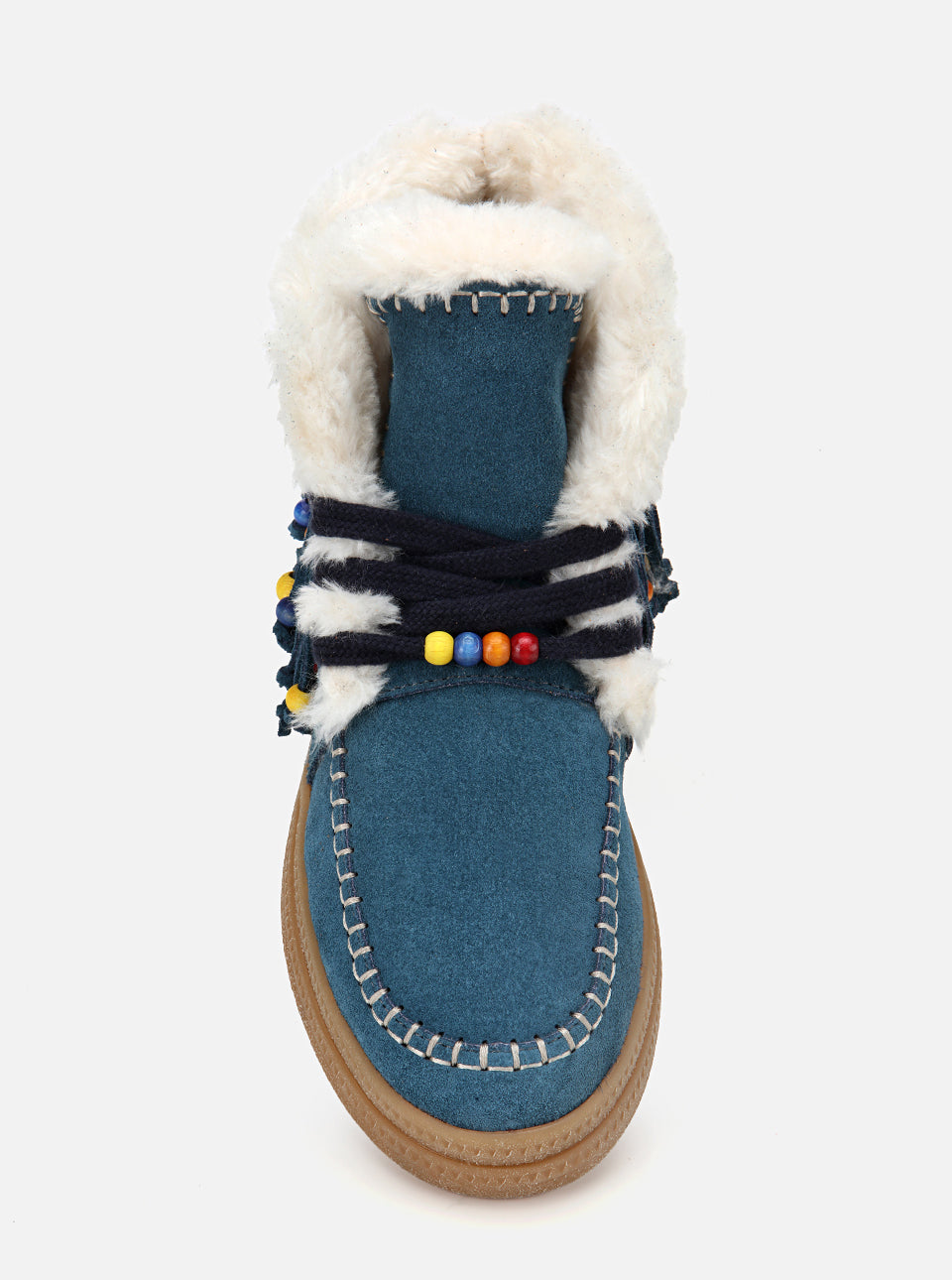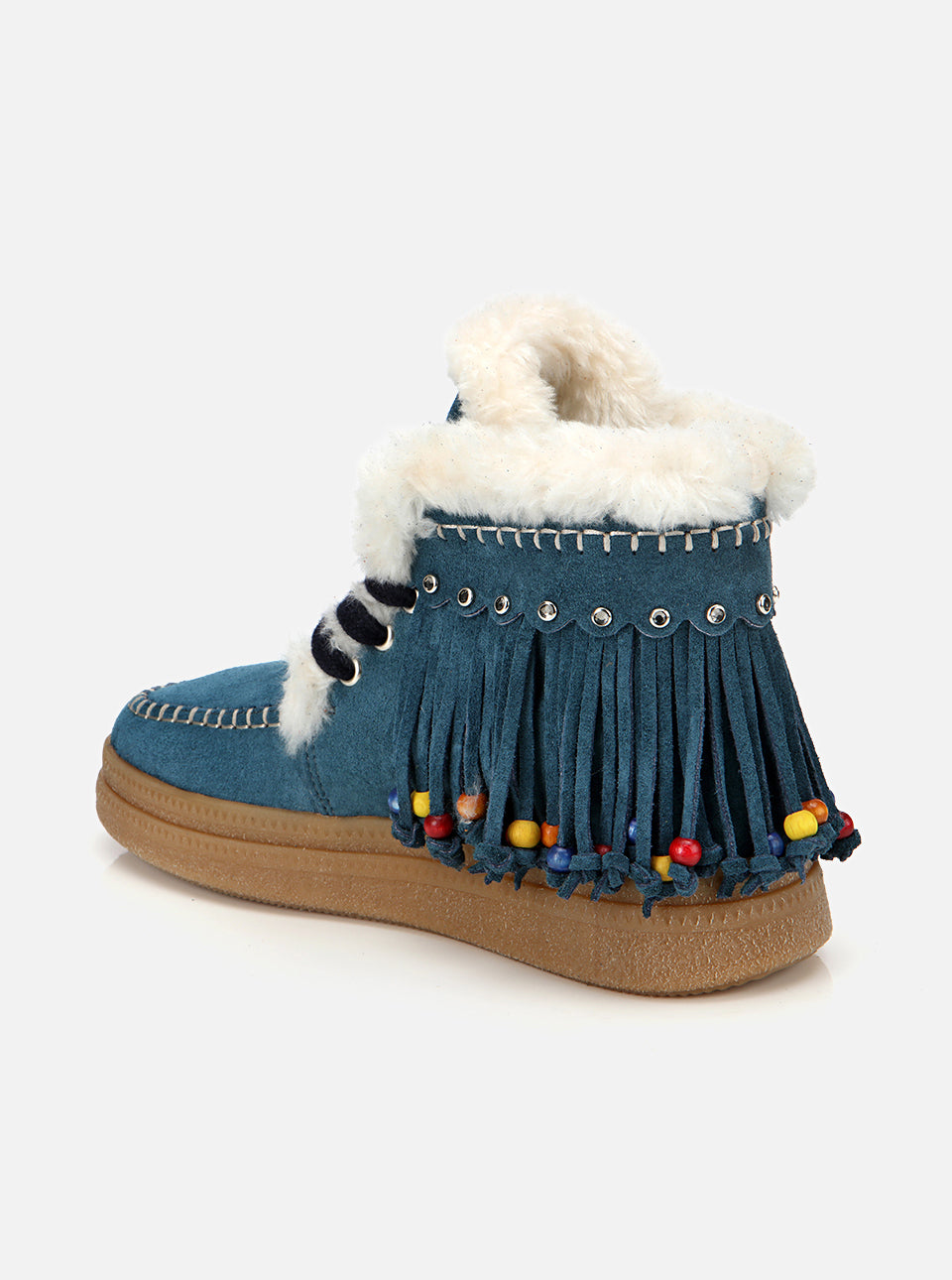 Opal Mavi rengi püsküllü renkli tahta boncuklu gerçek süet peluş astarlı kışlık bot.