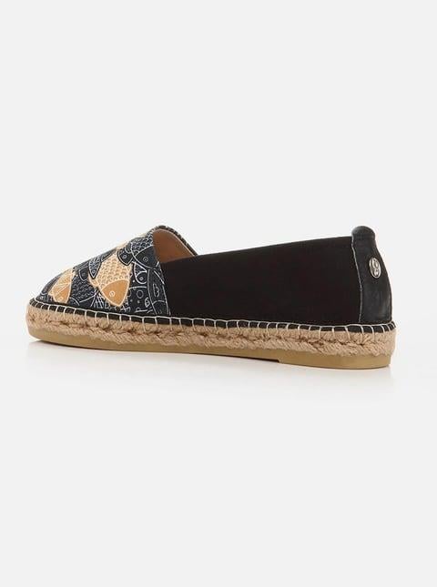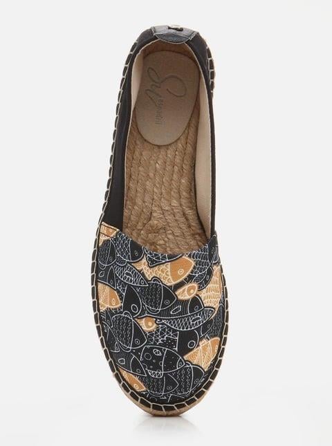 Siyah keten dokusunu tamamlayan hasır topuğu ve üzerindeki balık işlemeleri ile Anna düz espadril modeli, yaz sezonu boyunca pek çok farkı stile uyarlanabilir.